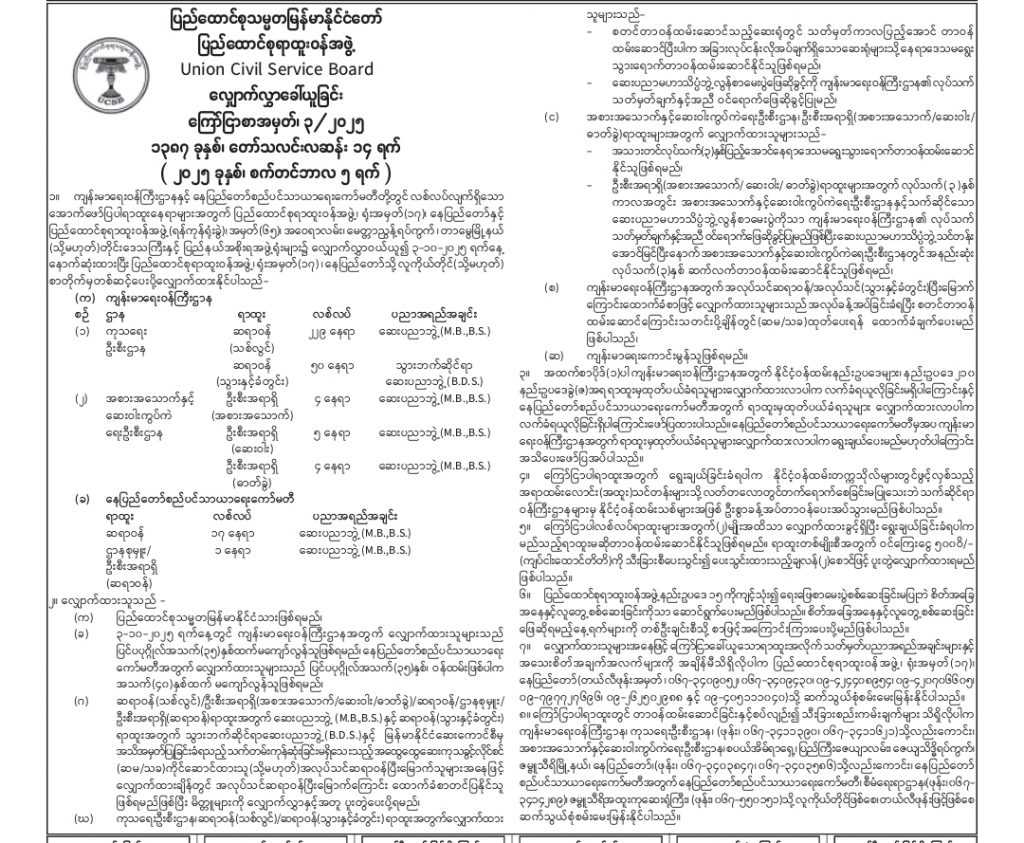 ကျန်းမာရေးဝန်ကြီးဌာန၊ ကုသရေးဦးစီးဌာနတွင်လစ်လပ်လျက်ရှိသော ဆရာဝန်(သစ်လွင်) (၂၂၉)ဦးနှင့် ဆရာဝန်(သွားနှင့်ခံတွင်း) (၅၀)ဦး ရာထူးနေရာများအတွက်လည်းကောင်း၊ အစားအသောက်နှင့်ဆေးဝါးကွပ်ကဲရေးဦးစီးဌာနတွင် လစ်လပ်လျက်ရှိသော ဦးစီးအရာရှိ (အစားအသောက်) (၄)ဦး၊ ဦးစီးအရာရှိ(ဆေးဝါး) (၅)ဦးနှင့် ဦးစီးအရာရှိ(ဓာတ်ခွဲ)(၄)နေရာ တိုအတွက် လည်းကောင်း ပြည်ထောင်စုရာထူးဝန်အဖွဲမှ နိုင်ငံပိုင် သတင်းစာများတွင် လျှောက်လွှာခေါ်ယူခဲ့ပြီးဖြစ်ပါသဖြင့် လျှောက်ထားလိုသူများအနေဖြင့် ၃-၁၀-၂၀၂၅ ရက်နေ့ နောက်ဆုံးထားပြီး ပြည်ထောင်စုရာထူးဝန်အဖွဲ၊ ရုံးအမှတ် (၁၇)၊ နေပြည်တော်သို လူကိုယ်တိုင် (သိုမဟုတ်) စာတိုက်မှတဆင့် ပေးပိုလျှောက်ထားနိုင်ပါ ကြောင်း အသိပေးအပ်ပါသည်။